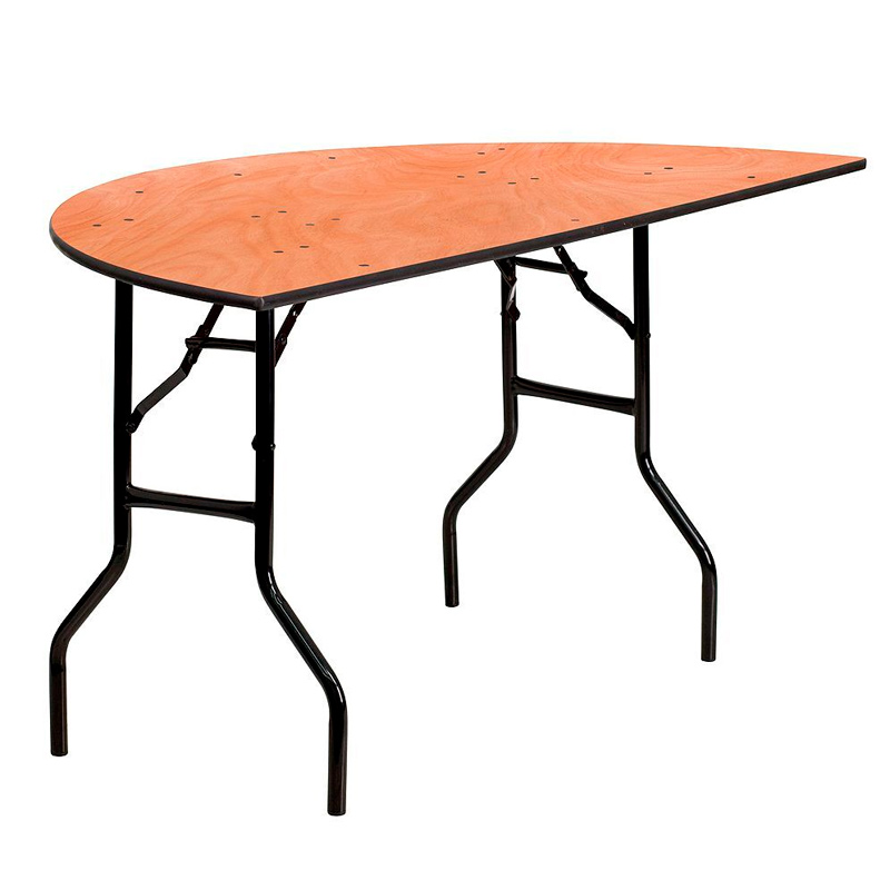 Introduce architectural versatility to your floor plan with our 60-inch Half-Round Folding Table. This semi-circle specialty piece is a favorite for event planners in Miami and Broward who need a sophisticated solution for sweetheart tables, intimate cake displays, or unique buffet configurations. Featuring a heavy-duty wood top and reinforced steel folding legs, it provides a stable, professional-grade surface for any upscale event.