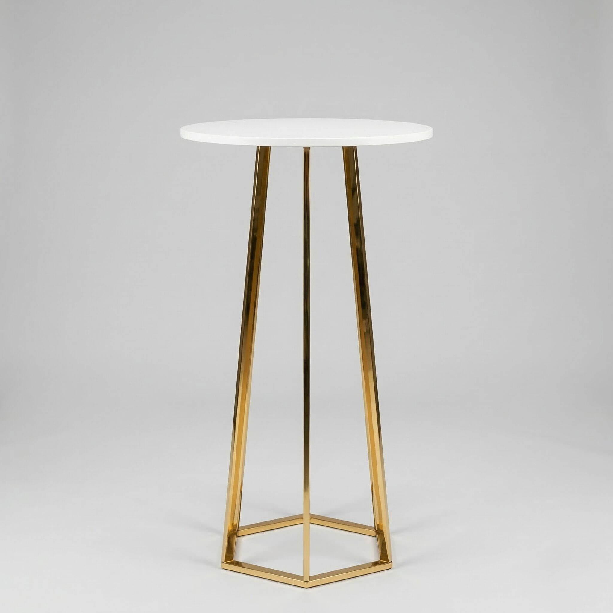 Introduce a touch of modern geometry to your event with our Gold Hexagon pedestal cocktail table, available exclusively at Red Events Rentals. This designer high-top features a sleek, open-frame hexagonal base in a polished gold finish, topped with a crisp white circular surface for a sophisticated, high-contrast look.