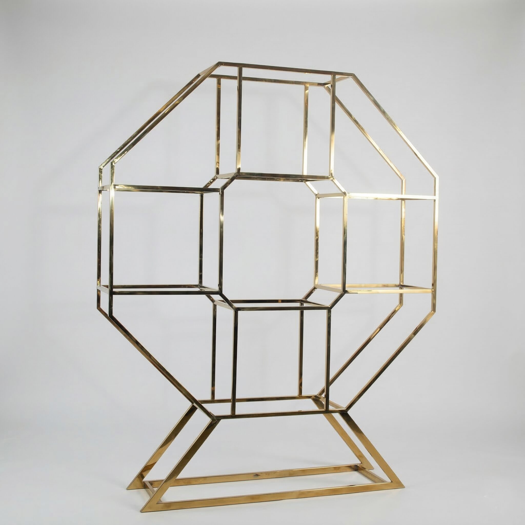 Make a bold architectural statement with our Gold Octagon Geometric Display Shelf, a flagship piece from the Red Events Rentals specialty collection. Featuring a striking ‘nesting octagon’ design and a high-shine gold finish, this open-frame shelving unit merges modern geometry with luxury event styling.