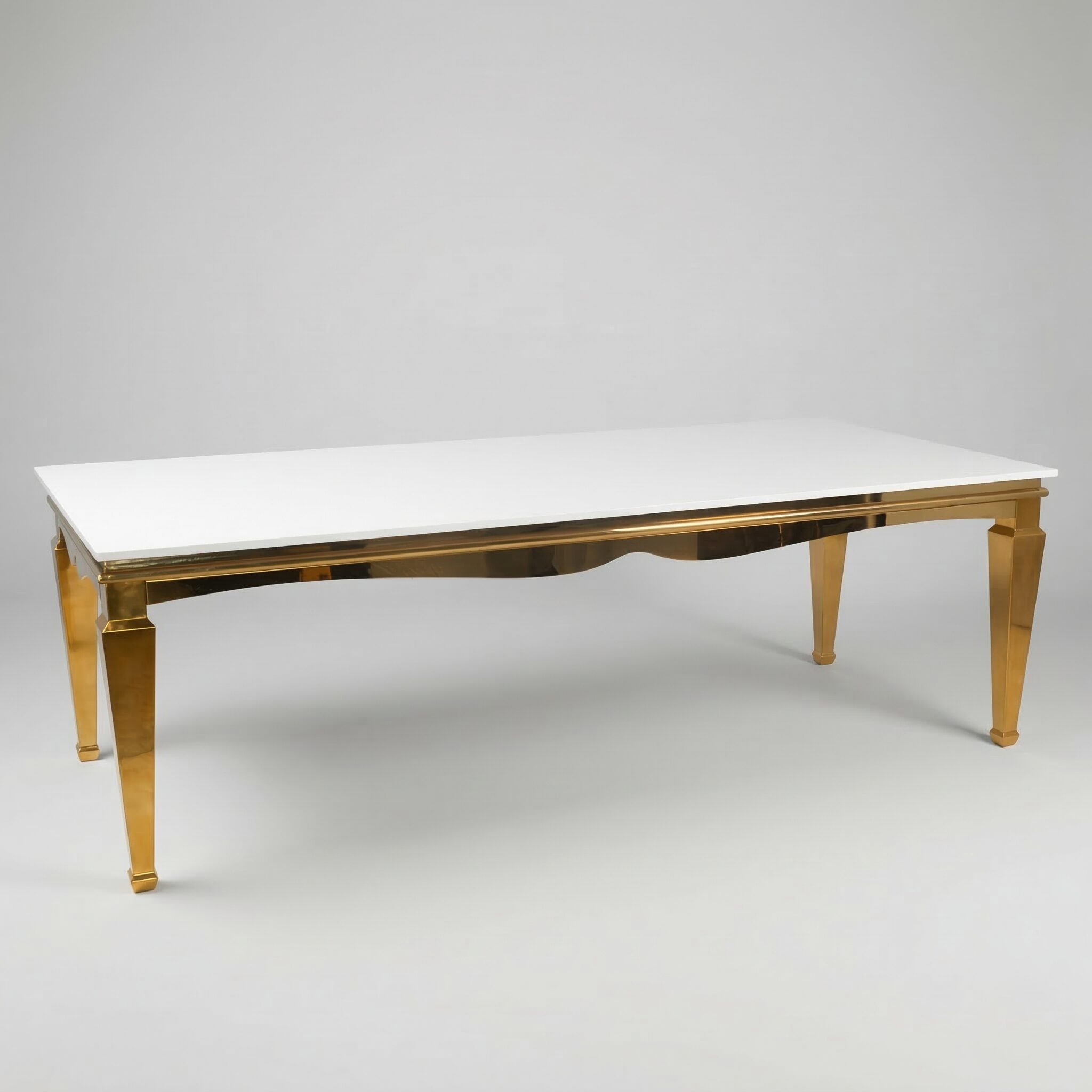 Redefine event luxury with the Gold Quinn Banquet Table, a flagship designer piece available exclusively at Red Events Rentals. Featuring a sleek, pristine white tabletop supported by a breathtaking, polished gold-mirrored frame and tapered legs, this table is designed to be the centerpiece of the room. Its high-fashion, open-base design eliminates the need for linens, allowing its stunning metallic finish to shine.