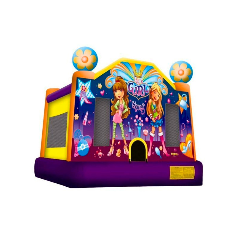 Celebrate in style with our It’s a Girl Thing Bounce House, the ultimate addition to fashion-themed birthday parties and glamorous girls’ day events in Miami and Broward. This vibrant inflatable features high-energy graphics showcasing fashion, accessories, and ‘girl power’ vibes, making it a standout centerpiece for any backyard celebration or community festival. With its bold purple, pink, and orange color palette, it provides a fun and trendy atmosphere that will keep your guests jumping for hours.