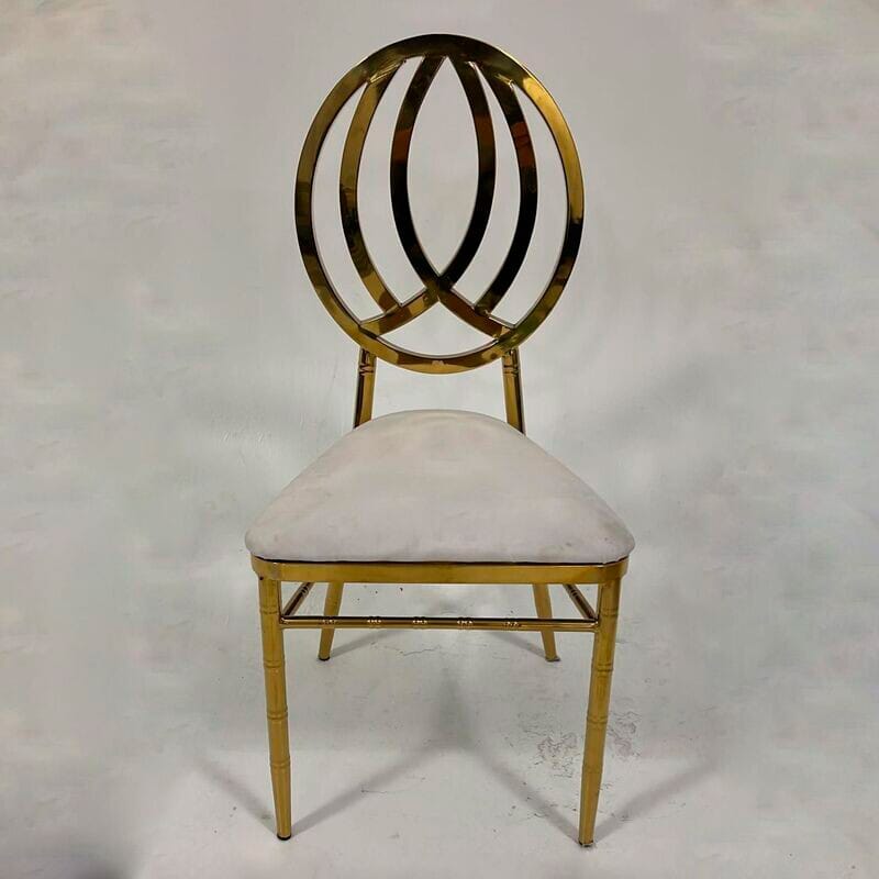 Finished in a high-luster, polished gold and paired with a plush white cushion, the Double Infinity chair is the premier choice for ‘ultra-luxury’ weddings and high-profile galas throughout South Florida. Its unique open-back silhouette adds a layer of intricate detail to your décor while maintaining a sleek, modern feel that doesn’t overwhelm the room.