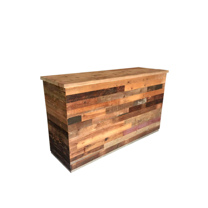 This professional Pallet Wood Rustic Bar is the ultimate centerpiece for organic, lodge, or vineyard-themed events across South Florida. Constructed with a multi-toned reclaimed wood aesthetic, this bar provides a warm and authentic atmosphere that serves as a functional beverage station and a major decor element. It is a premier choice for outdoor weddings in Weston, rustic corporate events in Miami, and chic farm-to-table parties in Fort Lauderdale.