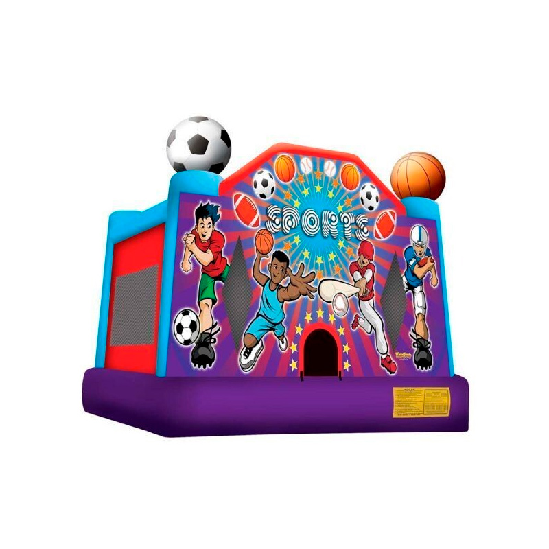 Score a home run at your next event with the Sports USA Bounce House, the ultimate high-energy attraction for young athletes in Miami and Broward. This vibrant, multi-sport themed inflatable is a crowd favorite for birthday parties, school field days, and community festivals. Featuring bold graphics of soccer, baseball, basketball, and football—complete with oversized inflatable sports balls crowning the turrets—this jumper creates an immersive ‘stadium’ atmosphere that keeps the competitive spirit high and the energy flowing.